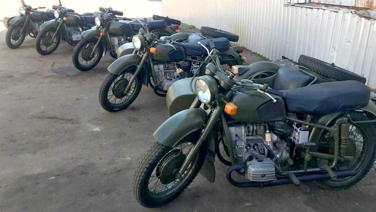У кожній партії було по п’ять мотоциклів вітчизняного виробництва. Це МТ-10-36 "Дніпро" Київського мотоциклетного заводу. Триколісні байки з боковими колясками пройшли через руки ремонтників і стали наче нові. Щоправда, класичні цивільні кольори довелося замінили сіро-зеленою фарбою матового відтінку, що для камуфляжного маскування доцільніше.