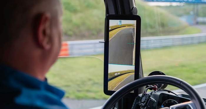 Замість звичайних дзеркал Mercedes eActros 600 мав камери, зображення з яких виводилося на монітори на передніх стійках кабіни. Фото: Daimler Truck