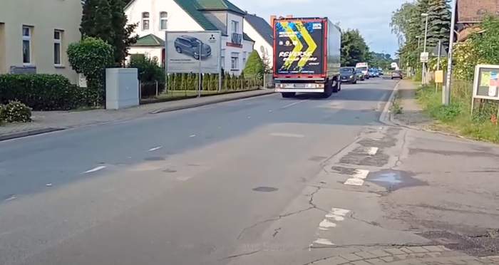 Mercedes eActros 600 пішов реверсним ходом не широким автобаном, а звичайною дорогою місцевого значення. Там було всього по одній смузі вперед та назустріч.