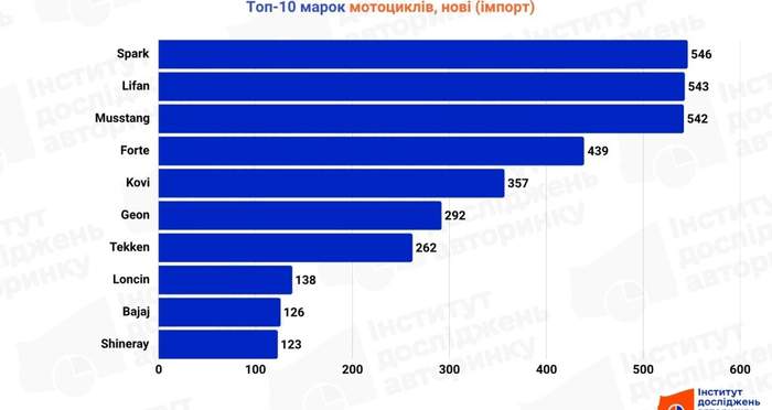 У сегменті нових мотоциклів в Україні за перше місце минулого місяця серйозно боролися аж три марки: Spark, Lifan та Musstang. Різниця виявилася буквально в кілька проданих мотоциклів, однак все ж вона є, і опираючись на неї ці марки й розміщені у Топ-10.
