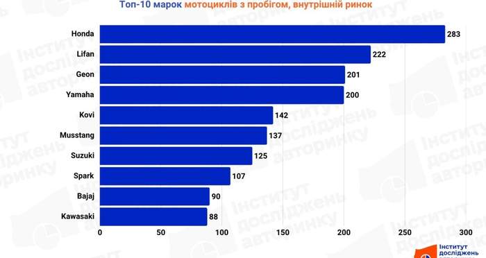 На внутрішньому ринку першість утримує Honda, однак друге і третє місця за китайськими марками — Lifan та Geon, які з дуже невеликою різницею витіснили на четверту сходинку Yamaha. І цей процес не можна назвати боротьбою за споживача на «вторинці», яка може з місяця в місяць приносити різні результати, оскільки ринок максимально активно поповнюється новими мотоциклами переважно китайського виробництва, тому надалі ми бачитимемо японські, американські чи німецькі марки все нижче у списку.