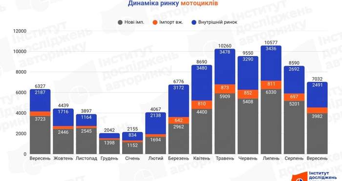 Загальний обсяг офіційно оформлених покупок мотоциклів усіх типів у вересні склав 7 тисяч. Ці обсяги менші, ніж були у попередньому місяці (серпні) на 18,1%, однак більші, ніж було торік у вересні-2024, на 11,2%. Наближення холодів бере своє, однак ця частина ринку все ж зростає, вважають експерти Інституту досліджень авторинку.