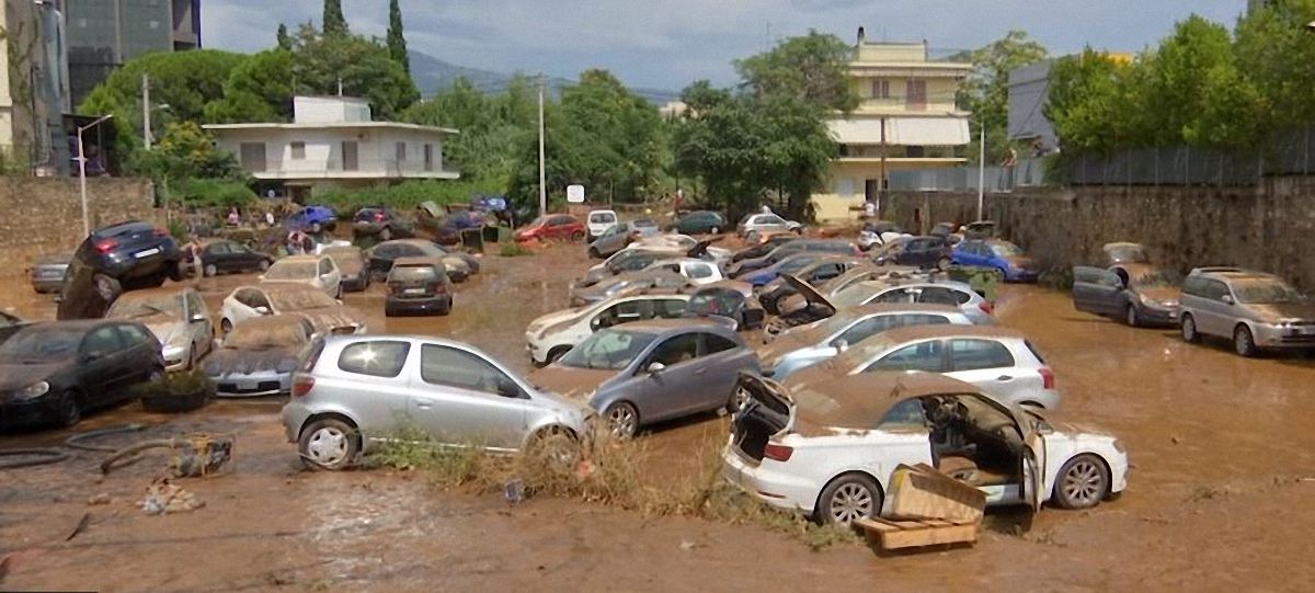 Передмістя столиці Греції Маруссі після страшних пожеж накрило ще й повінню. На одній зі стоянок в низині автомобілі плавали та застигли у різноманітних позах після відходу води. Багато з них повністю затоплені, пошкоджені від зіткнень одна з одним чи з огорожею.