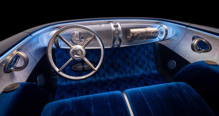 Салон Vision Iconic — це нове бачення автомобільної елегантності. Дизайнери Mercedes-Benz поєднали класичний стиль ар-деко з передовими технологіями, створивши простір, подібний до лаунж-зони. Центральним елементом є скляна приладова панель “Zeppelin”, яка поєднує аналогові прилади з цифровими екранами, а також годинник із логотипом Mercedes-Benz, що виконує роль інтелектуального асистента.