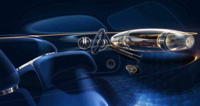 Обробка салону вражає: перламутрові інкрустації, полірована латунь, оксамитові сидіння темно-синього кольору, а підлога прикрашена ручною солом’яною маркетрі у стилі ар-деко. Цей інтер’єр створено не лише для керування — це місце для спокою, комфорту та насолоди від подорожі.