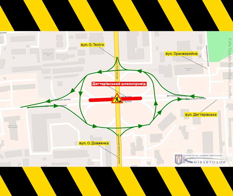 До 30 листопада має завершитись реконструкція Дегтярівського шляхопроводу. На час робіт рух на розв’язці організують за принципом турбіни й проїзд забезпечать в усі напрямки. Також працюватимуть тимчасові світлофори. Шляхопровід закритий для проїзду. У рамках реконструкції споруду повністю замінять.