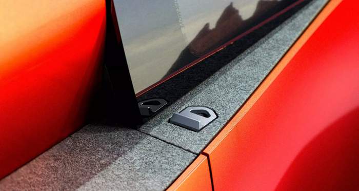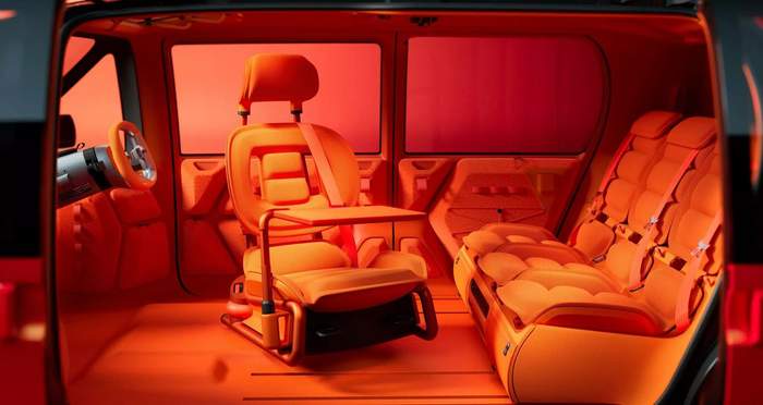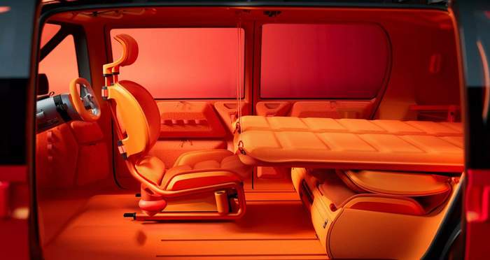 Відпочинок: салон перетворюється на спальню для двох. Два надувні матраци, створені разом з Decathlon на основі матеріалу Dropstitch, зберігаються в багажнику та надуваються вбудованим компресором. Скляний дах і “жираф”-секція дозволяють милуватися небом, а задні ліхтарі працюють як нічні лампи. Є місце і для переносного проектора зі висувним екраном — ELO буквально стає домашнім кінотеатром.