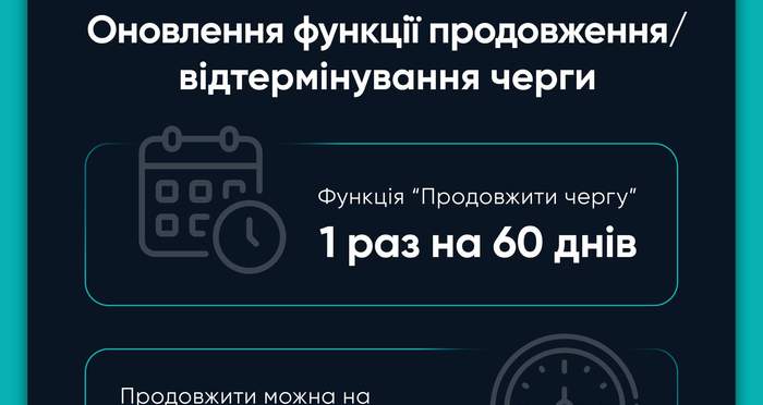 Окрім того, змінюється порядок продовження черги: продовжити місце в черзі можна лише 1 раз на 60 днів; продовження доступне буде на 4, 6, 8 або 10 годин.
