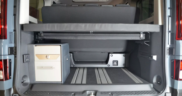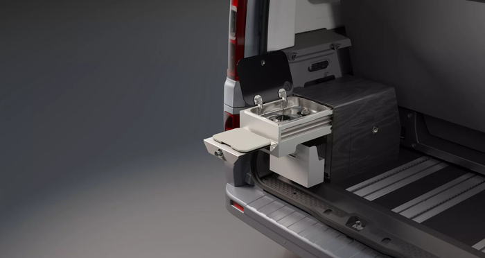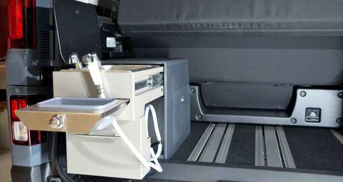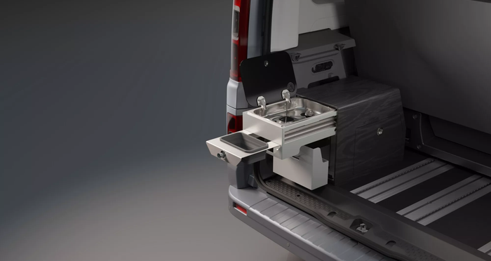 Комплектація кухні складається з вбудованої газової плити, розкладної раковини з розпилювачем. Також там є 5-літровий бак для чистої води та місце для зберігання речей, що перетворює автомобіль на справжній кокон на колесах.