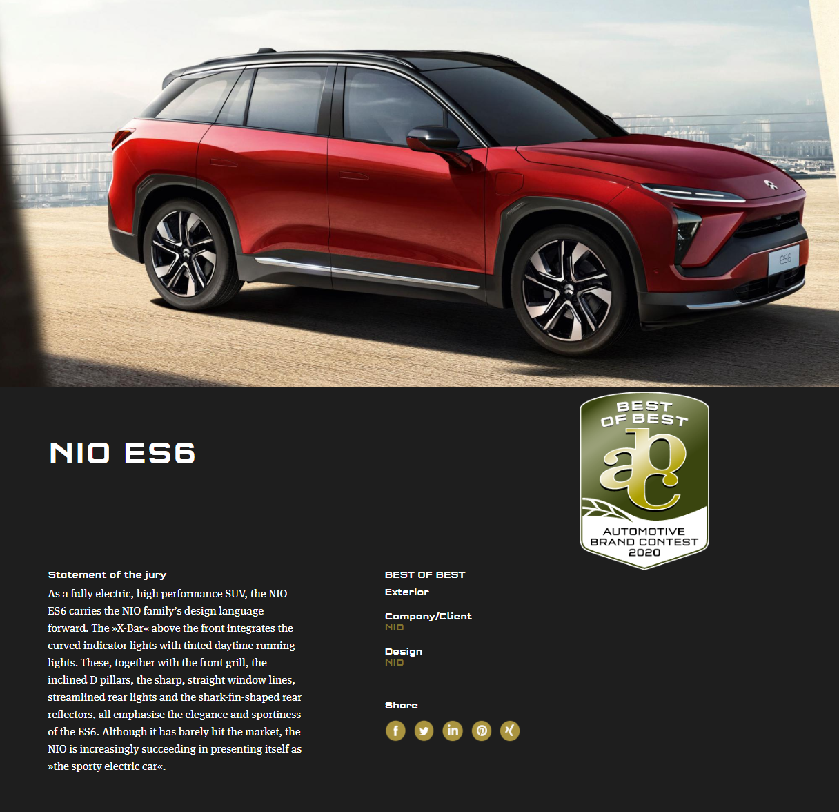 NIO ES6 получил титул Best of Best в Automotive Brand Contest 2020.