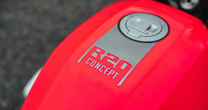 Алюминиевый резервуар получил новый дизайн и представлен в прогрессивном цвете с 1970-х годов. Концепт BMW R20 по цвету согласуется с крышками головки блока цилиндров, крышкой ремня и воздухозаборными воронками из полированного и анодированного алюминия, а также стойкой Paralever, системой подножки и тормозными суппортами ISR из бронзы.