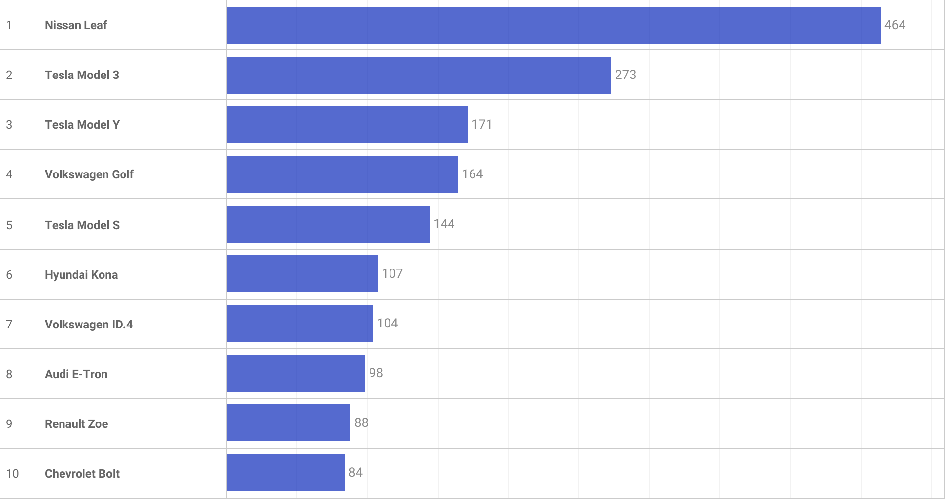 Среди отдельных моделей, которые чаще всего пополняли украинский автопарк, первенство получает Tesla Model Y, сместив многолетнего лидера Nissan Leaf на второе место. Третья строчка за Tesla Model 3.