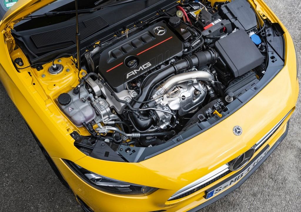 Новый Mercedes-AMG A35 оснащается модифицированным двухлитровым турбо-мотором M260 – тем самым, что прячется под капотом не-AMG модели. Однако в спортивном исполнении этот мотор развивает 305 л.с. и 400 номов. Двигатель соединен с семиступенчатым “роботом” с двойным сцеплением AMG Speedshift DCT 7G. Горячий хэтчбек имеет полноприводную трансмиссию.