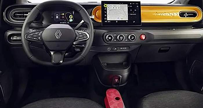 Как и в моделях Dacia, элементы управления климатом сохранили физические кнопки. Яркие акценты на панелях добавляют настроения - желтая вставка и красная декоративная полоса между сиденьями напоминают о молодежном характере Twingo. Автомобиль использует электрическую архитектуру AmpR Small (ранее CMF-BEV).