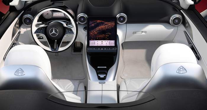 Родстер имеет такие же дисплеи мультимедиа и цифровой панели приборов, однако они получили уникальную анимацию и графику, соответствующую стилю Maybach. Руль, сиденья, нижняя панель приборов и дверные панели отделаны кристально-белой кожей Nappa.