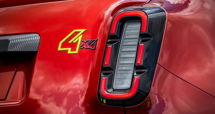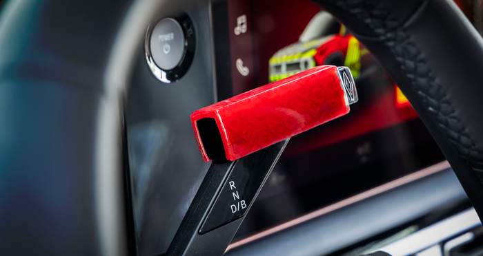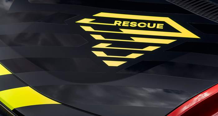 На кузове автомобиля есть уникальное красное покрытие, вдохновленное волнистыми цветами огня, что подчеркнуто флуоресцентными диагональными желто-зелеными линиями. На капоте и крыше есть шевронный узор, который напоминает коды экстренных служб. Слова “RESCUE” и “SAPEURS POMPIERS” (пожарные службы) расположены по диагонали крупным шрифтом на боковых панелях, а номера экстренных служб 112 и 18 четко видно на задних боковых панелях.