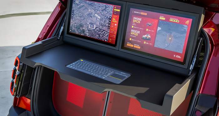 В багажнике есть командный центр, а полка была заменена раздвижным рабочим столом с двумя экранами, подключенными к компьютеру, что позволяет управлять дроном. В нижней части расположены два багажных ящика, предназначенные для хранения аварийного оборудования, необходимого пожарным, включая шлемы и сумки, а также электронного оборудования (планшеты, рации и т.д.), которое постоянно заряжается.
