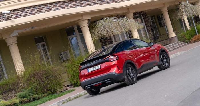 В нашем случае e-C4 в красном цвете выглядит довольно агрессивно. Все – благодаря купеобразному силуэту, высокому клиренсу (19 см, что важно для наших дорог) и защитным пластиковым накладкам, которые придают ему вид кросс-хэтчбека. Электрическую версию выдают едва заметные синие акценты, шильдики "ë" и, конечно, отсутствие выхлопной трубы.