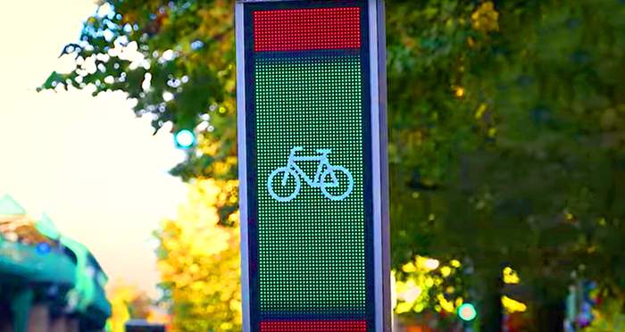 Установленный в 200 метрах от перекрестка своеобразный светофор покажет велосипедистам, доедут ли они до следующего перекрестка на зеленый или красный свет, если будут продолжать двигаться со скоростью 20 километров в час.