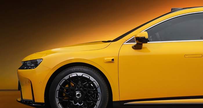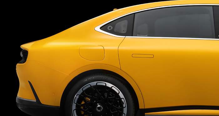 Седан отримав агресивний і спортивний зовнішній вигляд із яскравим жовтим кольором, жовтими супортами, низькою лінією даху та активним заднім крилом. Передня частина виділяється суцільною світловою панеллю та великою чорною нижньою решіткою. На даху розміщено лідар, що прямо вказує на розширені системи допомоги водієві та напівавтономне керування. У профілі видно приховані ручки дверей та бічні камери.