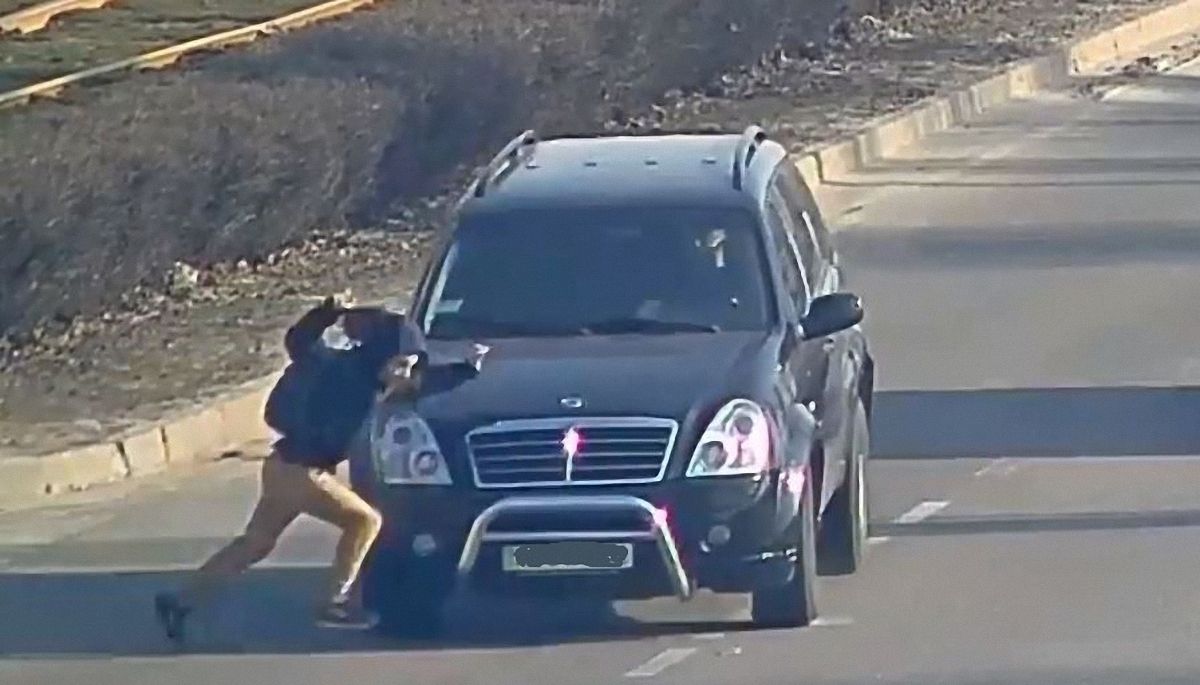 Цікаво, що "герой" сюжету не зовсім перебігав дорогу, а навіть трохи підстрибнув та згрупувався перед ударом, який у цьому випадку був неминучий. Тобто явно очікував зіткнення. Хлопець вдарився у проїжджаючий позашляховик SsangYong і його відкинуло на узбіччя.