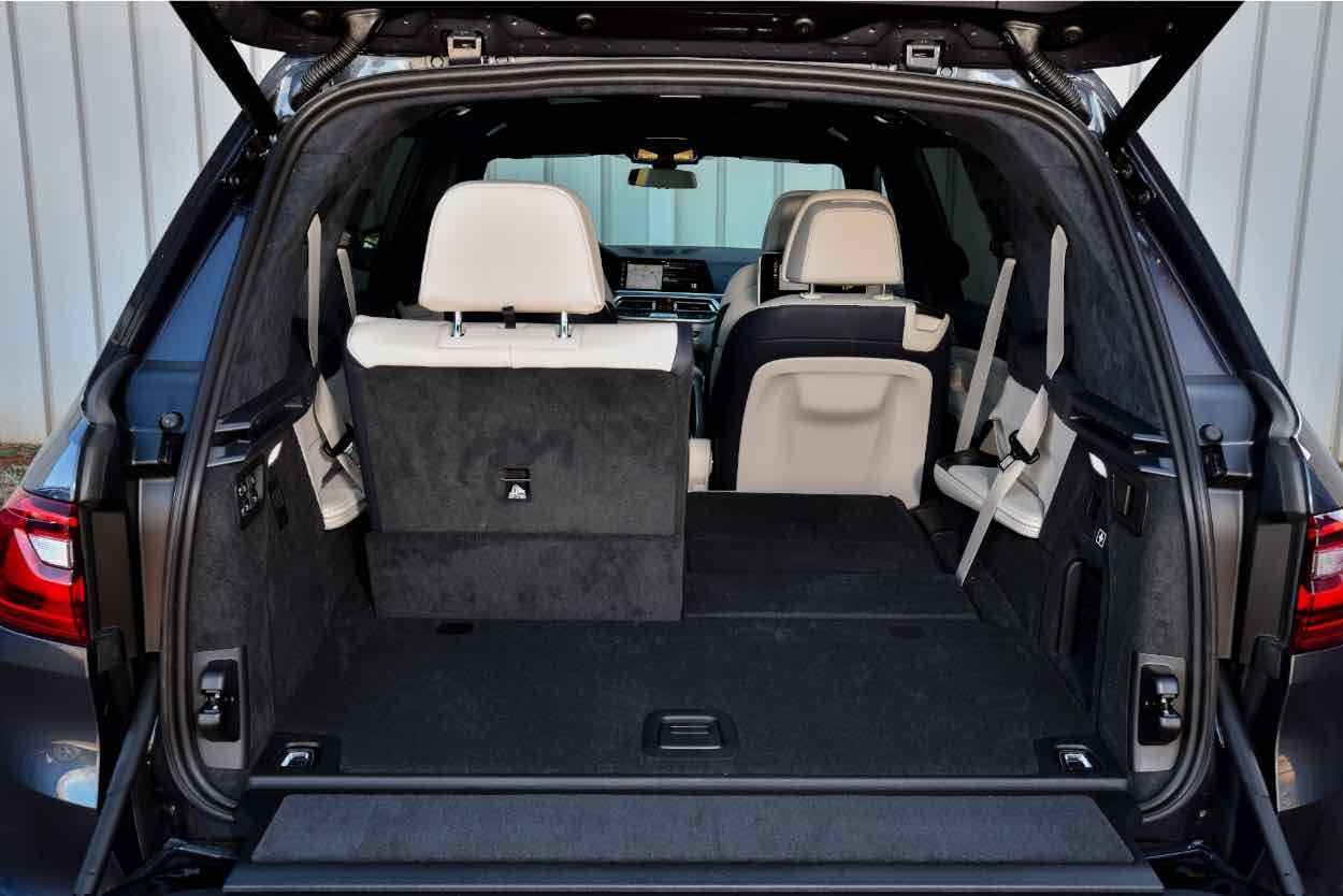 У машини з трьома рядами крісел в багажник влазить 317 літрів, а якщо скласти спинки заднього ряду, то об’єм збільшиться до 1376 л. До речі, доступ у багажник забезпечують такі ж двері, як і у Х5. Вони складаються із двох половинок, що мають електроприводи.