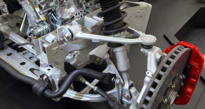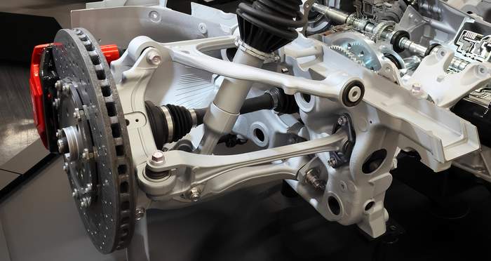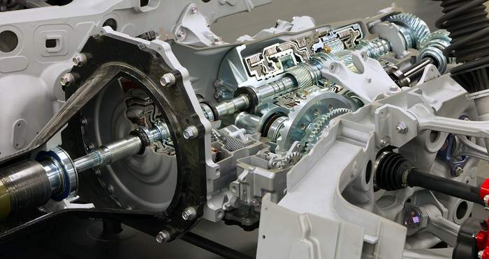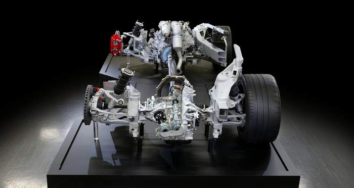 Коробка передач розташована ззаду, як у справжніх спорткарів, і з’єднана з двигуном через карбоновий вал. Паливний бак, батарея і трансмісія розташовані так, щоб розподіл мас був у пропорції 45:55 на користь задньої осі.