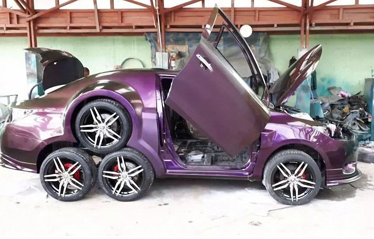 Відповідь на це запитання, мабуть, знає конструктор автомобіля, який зняли на відео в Індонезії. На відео видно автомобіль Toyota Vios, який їде з такою конструкцією. Причому всі три осі обертаються. Хоча швидше за все, привода на них немає – автомобіль-донор передньопривідний.