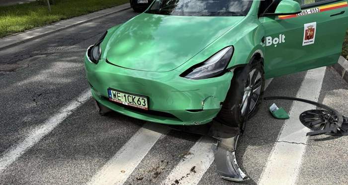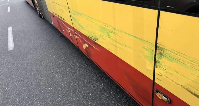 Як повідомляє Miejski Reporter, спочатку автомобіль з символікою Bolt врізався в автобус, добряче подряпавши його борт. Далі автомобіль понесло на бетонні перегороджувані бони, від чого легковик ще більше постраждав.
