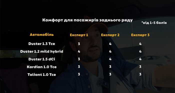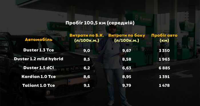 Водночас тест на витрати показав, що бортові комп’ютери в автомобілях Renault досить точні: реальна розбіжність з заміром “по баку” становила лише 0,5 літрів. Найбільш економним виявився Renault Duster з 1,5-літровим дизелем, тоді як найвищі витрати мав Renault Taliant. Усі оцінки експертів, а також показники споживання пального, наведені в таблицях вище.