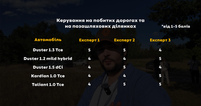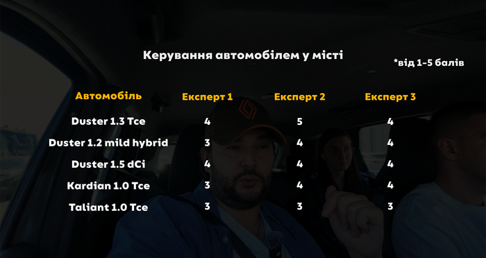 “Народні експерти” за підсумками тест-драйву виставляли відповідну оцінку тестовим автомобілям у кожній з категорії. Найчастіше вони залишали схвальні відгуки про керованість та підвіску моделей Renault, однак також окреслили декілька мінусів. Серед них – жорсткі матеріали в салоні, хоча в моделях такої цінової категорії це цілком нормально. Також думки експертів розділились між різними силовими агрегатами “Дастерів”.