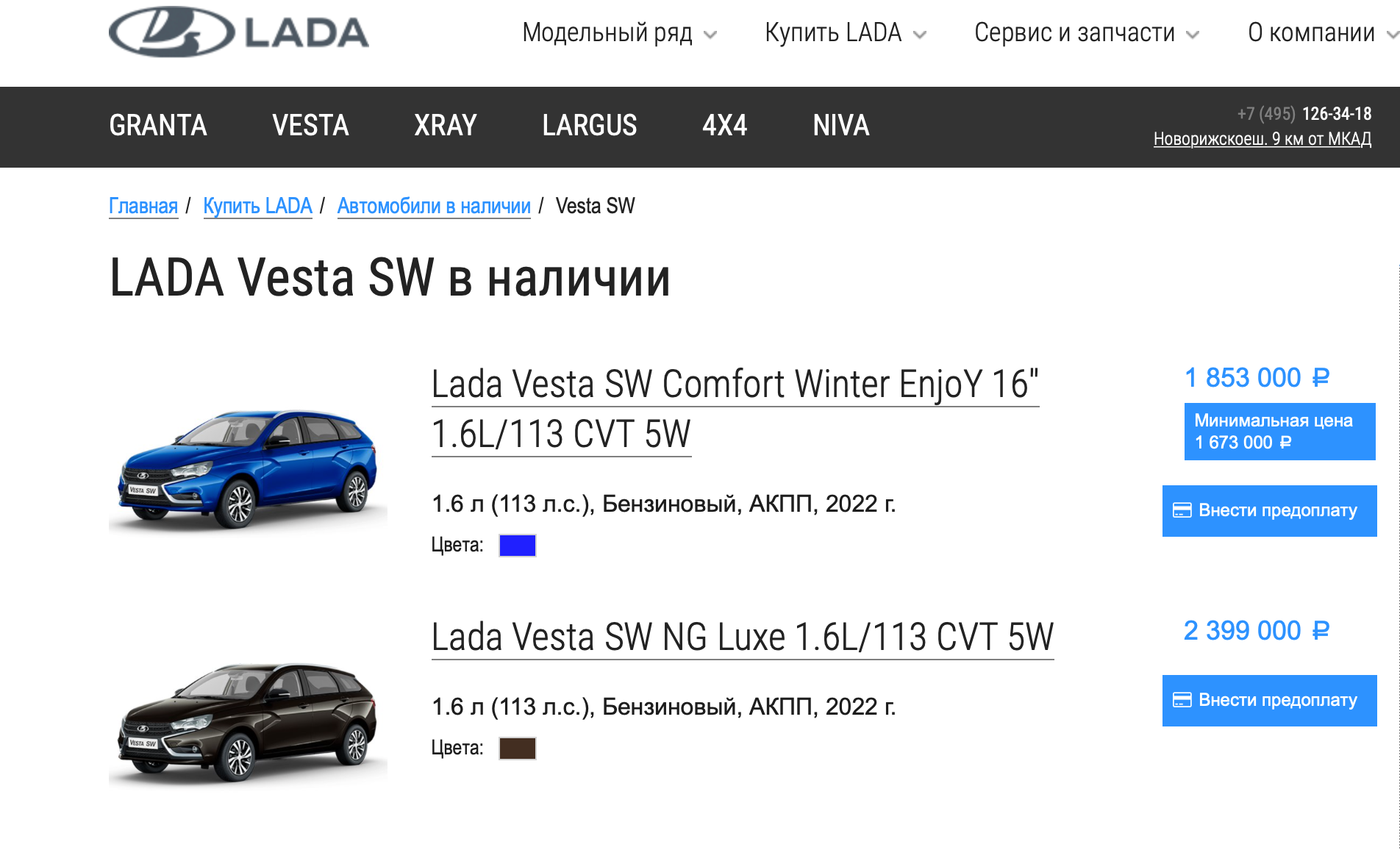 Наприклад, топ-версія російського універсала з автоматичною трансмісією Lada Vesta SW один з московських автосалонів продає за 2 399 000 російських рублів. В перерахунку на долари, якщо користуватись офіційним обмінним курсом, це становить 39 000 дол. США.