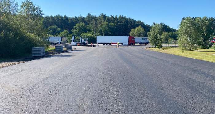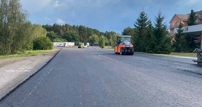 На одному з під’їздів до пункту пропуску уже укладено перший з трьох передбачених проєктом шарів асфальтобетонного покриття, та розпочато роботи з влаштування тротуару.