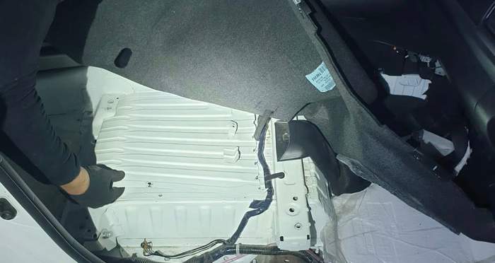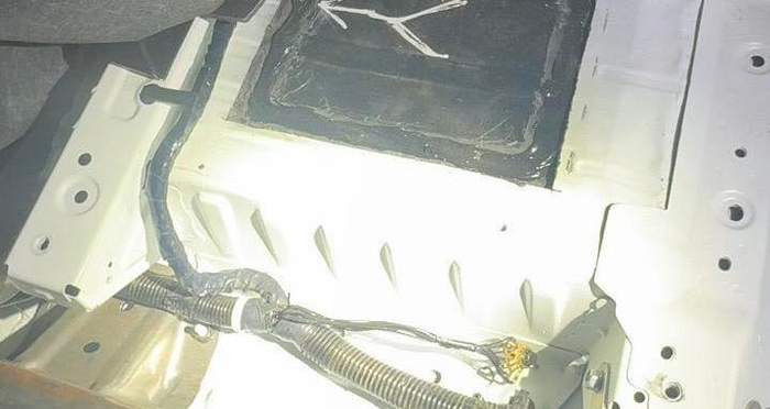 В ході ретельного огляду виявлено спеціально виготовлений тайник у підлозі автомобіля. Доступ до нього з'явився лише після демонтажу передніх сидінь.